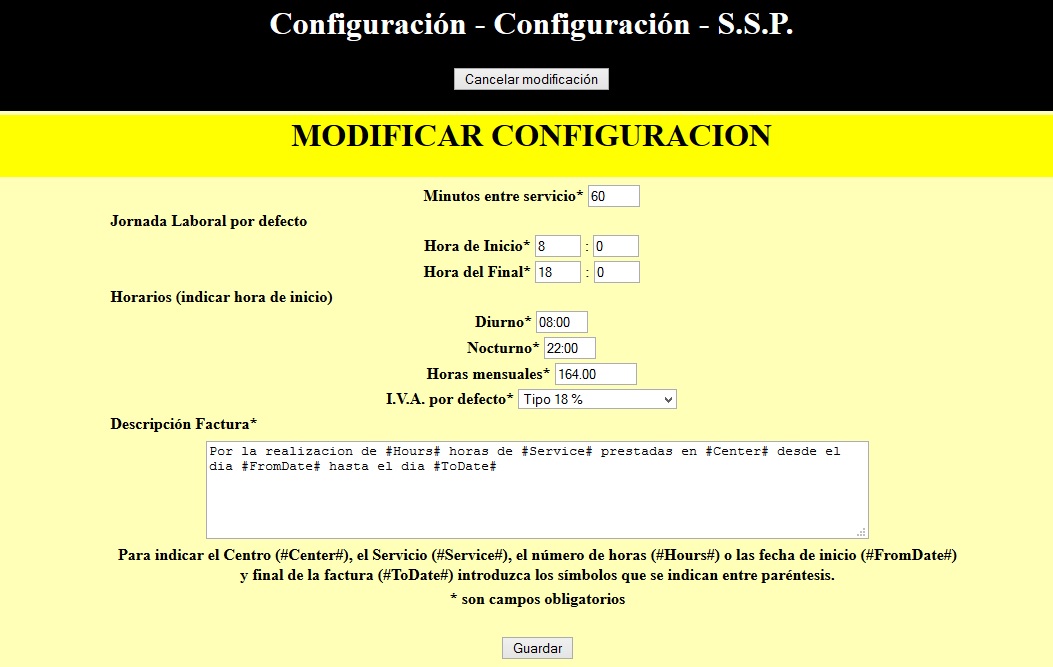 El modo de operación del sistema se puede controlar a través de la sección de Configuración Entre otros aspectos, se puede configurar los minutos entre servicios para evitar solapamientos. Definir la jornada nocturna y diurna. La jornada laborar por defecto en la planificación. El seguimiento inicial de una factura, el tipo de impuesto a aplicarse automáticamente, la descripción de la factura personalizada. |